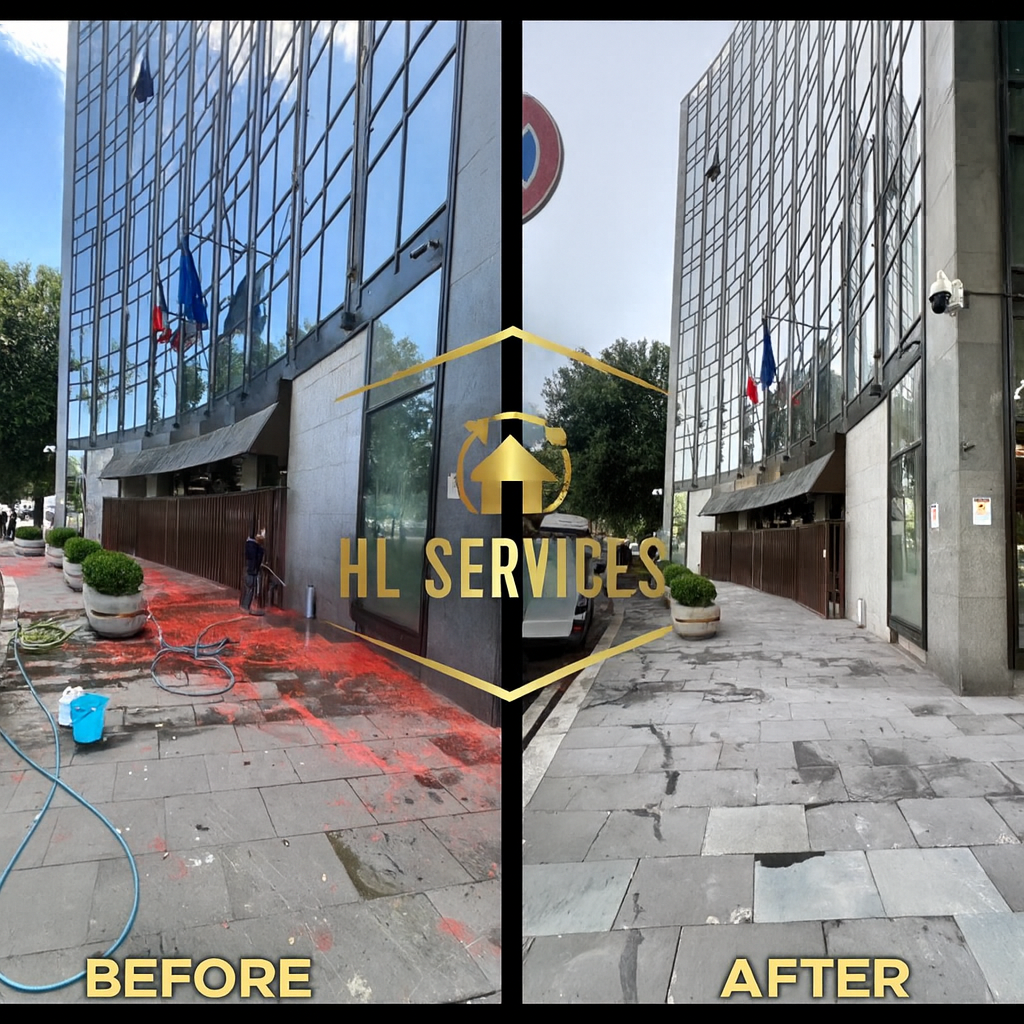 Intervento rapido di rimozione di schizzi di vernice causati da una manifestazione. HL Services ha ripristinato completamente il marciapiede e l’ingresso della sede Leonardo, garantendo una pulizia impeccabile senza alcuna alterazione delle superfici.